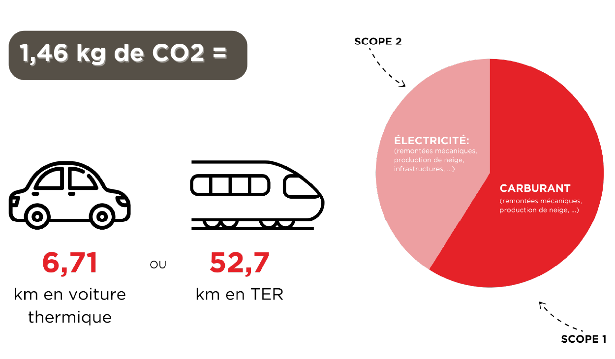 sur une journée de ski, le transport représente 52% des émissions de CO2. Cela équivaut à environ 25 kg de CO2 par skieur… autrement dit, 30 heures d'un sèche-linge qui tourne en continu.