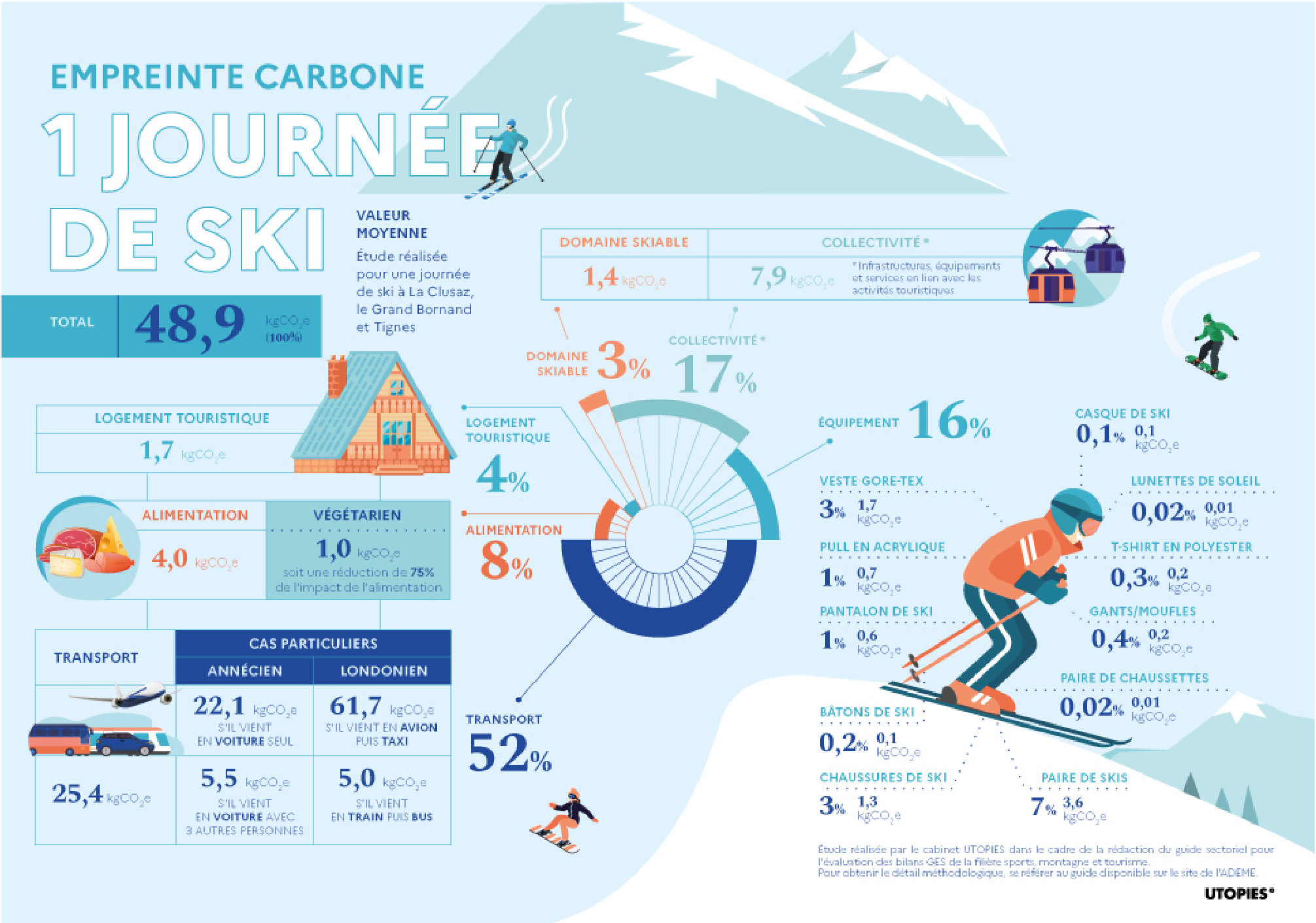 Infographie réalisée par Utopies/ADEME en prenant en compte les données de 3 destinations touristiques La Clusaz, Le Grand Bornand et Tignes pour une journée de ski. Guide sectoriel filière sport, montagne et tourisme, Février 2022.
